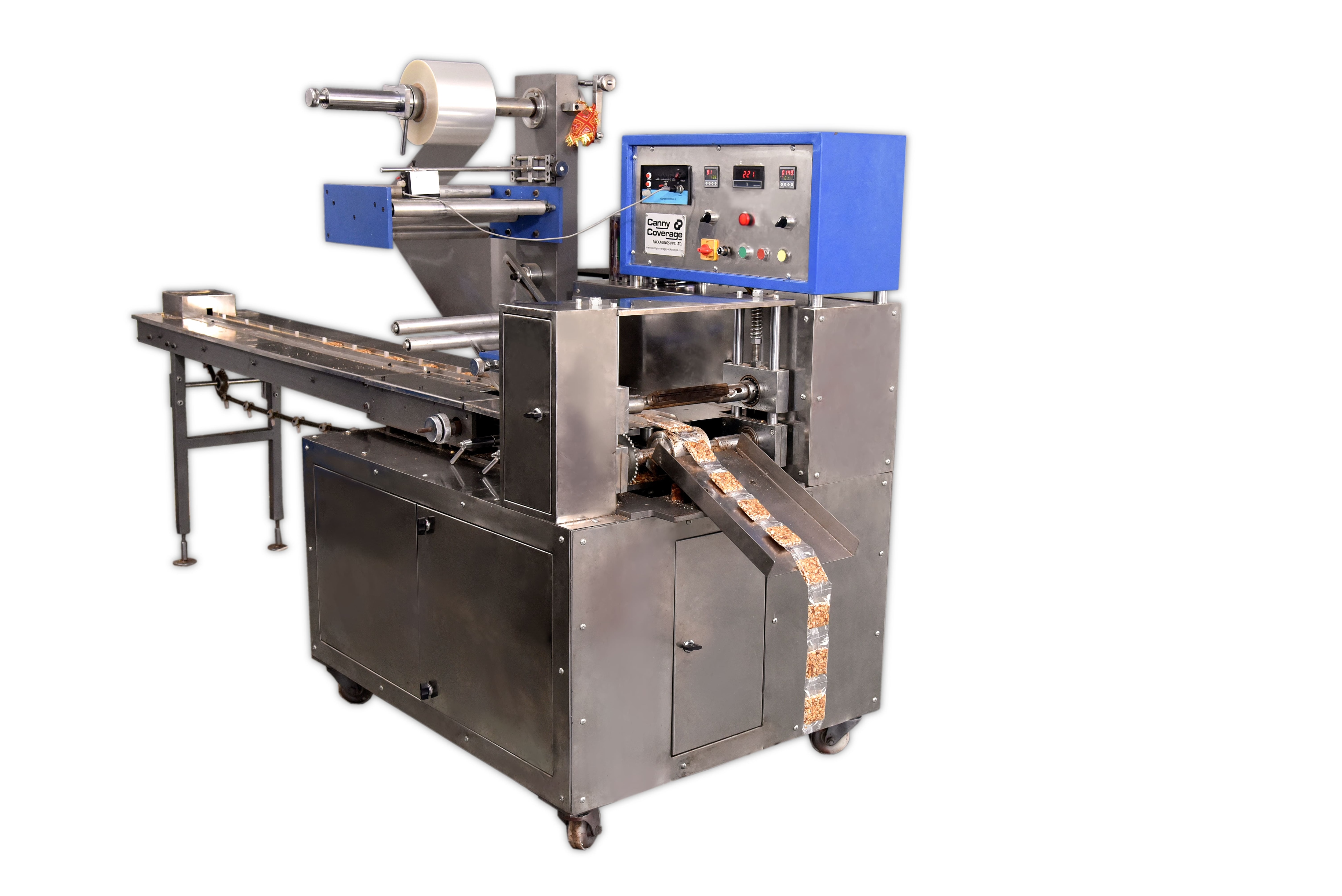 Suitable for packing Biscuits, Chocolates, Soaps, Stationary Item, Syringes, Ball Bearing and any other Rounded, Square Shaped Solid Products. Feeding System Automatic and Manual Sealing Type Centre seal / 4 side Packing Size Upto 300mm(L), 180mm(W), 100mm(H) Packing Speed 0-200 pouches per min, Variable Power (W) 3kW, 1HP AC with AC Drive Voltage (V/Hz) 220 AC(Single Phase) Heater Load 400W * 2 Nos., 200W * 2 Nos. Dim. LxWXH(mm) 1800 * 1080 * 1700mm Approx. Weight 700 Kg Optional Attachment Batch Coding Mahchine