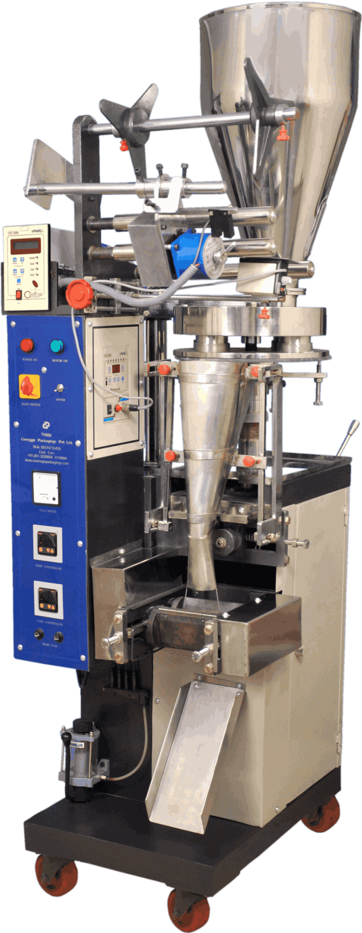 Capacity :- 2 to 5gm / 5 to 20gm/ 20 to 100gm/ 100 to 250gm/ 250 to 500gm/ 500 to 1000gm sealing Type:- Centre seal or back side seal , 3 side seal , 4 side seal Film Size :- 80mm to 450mm Width, any length can do speed :- 12 to 80 pouches per minute Voltage :- 1/2 HP Motor , 22v , 50Hz Single Phase Packing Material :- Any Heat sealable laminated film such as polyester / polypaper / poly, Glassine / poly, Polyester ,/ Met / Poly, Polyester / Foil/ Poly, BOPP/ Foil / Poly Approx. Weight :- 380kg - 450kg Optional :- Batch Coding Device, Level Sensor Device, Gas Flashing Arrangement , Screw feed Conveyor Air Compressor :- 3HP Double Piston https://youtu.be/vSwvlBIPeCg